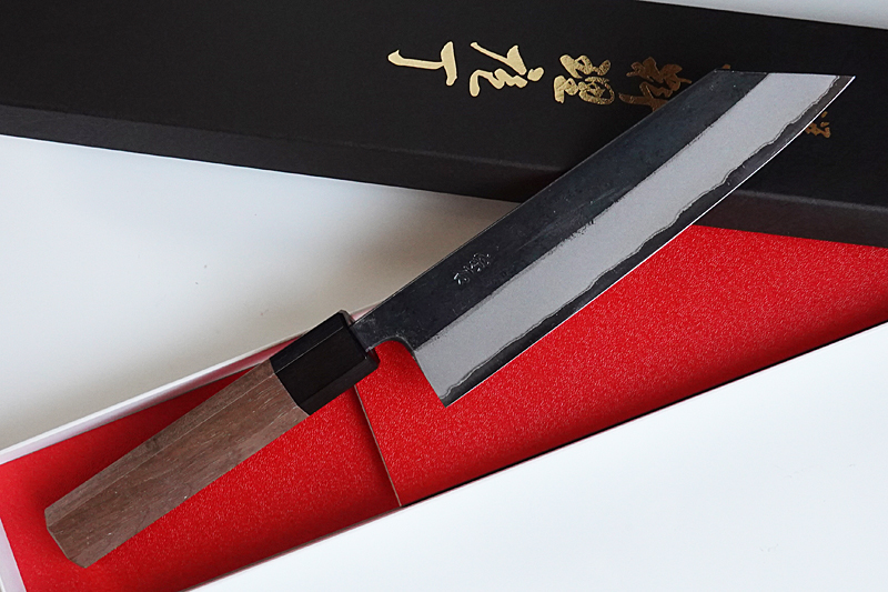 刃の素材:鋼材は日立金属の青紙二号を使用。ステンレスではありませんのでお手入れを怠ると錆びが出ますが、ステンレスの包丁より良く切れ、また研ぎやすいです。そして研ぎこむことで一層切れ味がアップするでしょう。食材に対する”噛みつき”、”食い込み”が良い、などと表現されますが、ステンレスの包丁とはまた質の違う切れ味を感じて頂けます。