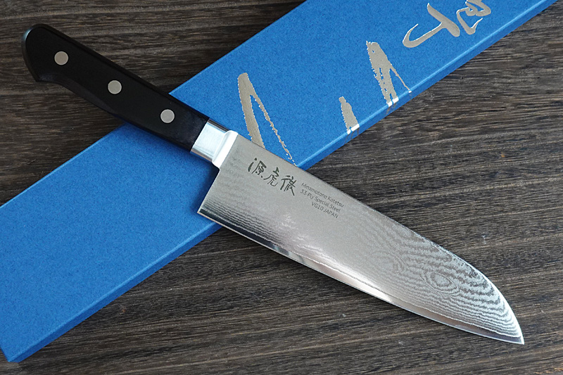 良く切れて錆にも強い、プレゼント用としても人気!岐阜県関市製の美しいV金10号ダマスカス三徳包丁です。刃渡り18cmで約160グラム、一般的なご家庭用にちょうど使いやすいサイズ。重すぎず女性の方にもお薦めできます。